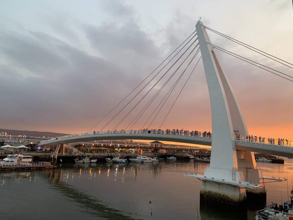 ▲漁人碼頭地標情人橋。春節期間來到淡水漁人碼頭,民眾可悠閒漫步於木棧道上,迎著海風輕拂,感受港區獨有的海洋氣息。漁人碼頭視野遼闊,白天可遠眺港外觀音山與淡水河口交會的壯麗景緻,還能欣賞港內漁船停泊在浮動碼頭的港灣風情,兼具漁業與觀光的獨特魅力。港區地標情人橋更是不可錯過的必訪景點,白日裡猶如白色風帆橫跨港區,與藍天碧海相互輝映,成為淡水最具代表性的港灣地標;傍晚時分夕陽西下,金黃餘輝灑落水面,形成浪漫絕美的夕照畫卷,吸引不少遊客與攝影愛好者前來追逐落日,淡水夕照亦是臺灣八景之一。