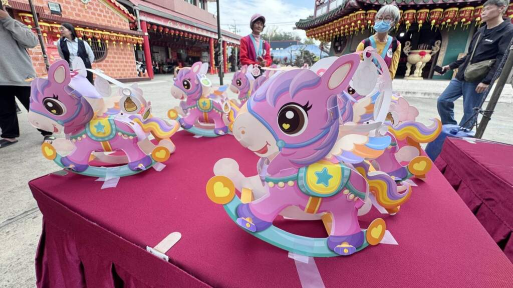 ▲今年因應馬年提供馬年小提燈,以及招財金及福德老爺紀念金幣。(圖/記者林明佑攝)王惠美指出,今年因應馬年提供馬年小提燈,以及招財金及福德老爺紀念金幣,配合迎燈排活動,113年文化局發表的臺語故事繪本《白沙坑迎燈排的奇幻旅程》特別在文德宮內進行繪本專區布置,讓大小朋友透過繪本,輕鬆了解白沙坑迎燈排的由來。邀請大家來文德宮走春,了解地方文化與歷史淵源,還能向土地公祈福、欣賞迎燈排,保佑身體健康、升官發財。