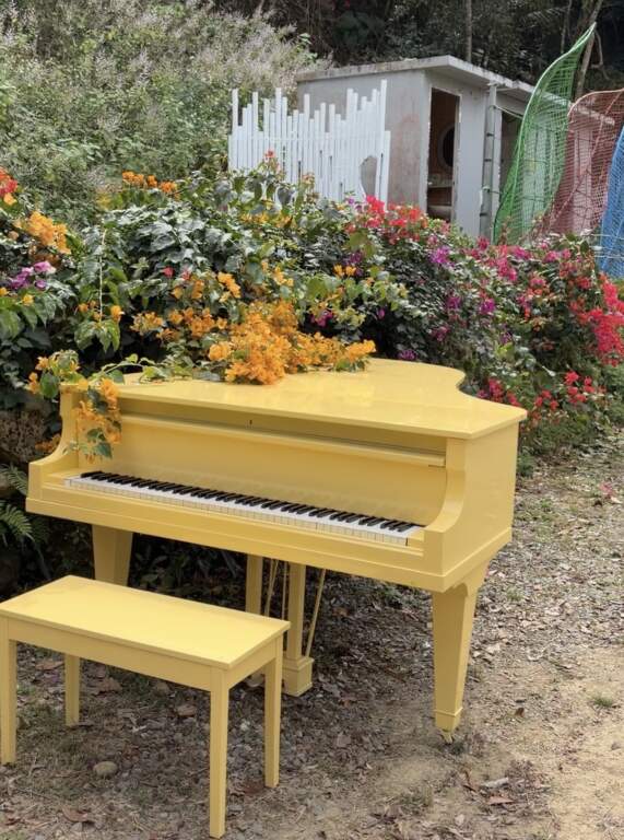 ▲由於廖墩均本業從事鋼琴維修,特別將部分外型典雅的鋼琴移置戶外展示,有的可供彈奏,有的作為裝置藝術,與花海相互襯托,沒有禁止觸摸的標語,讓遊客既能拍照,也能即興演奏,成為園區另一亮點。(圖/記者蘇彩娥攝)值得一提的是,園區內還設有全台少見的戶外大型白色平台鋼琴。由於廖墩均本業從事鋼琴維修,特別將部分外型典雅的鋼琴移置戶外展示,有的可供彈奏,有的作為裝置藝術,與花海相互襯托,沒有禁止觸摸的標語,讓遊客既能拍照,也能即興演奏,成為園區另一亮點。