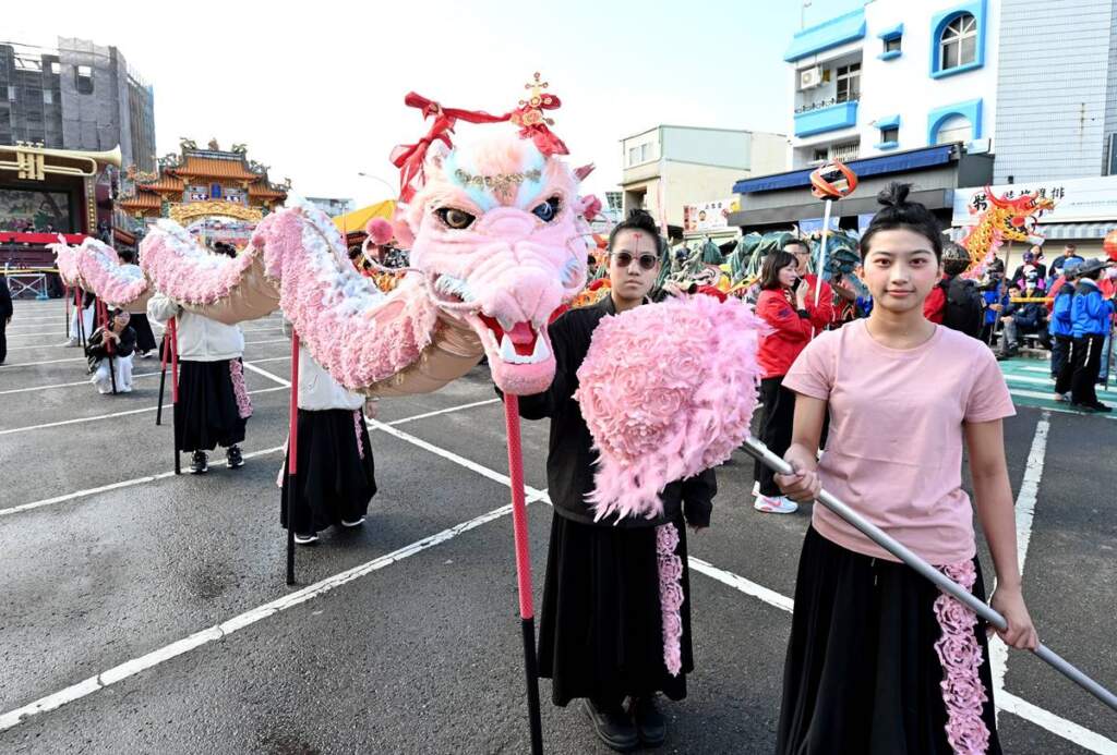 ▲「舞空術劇團」的祥龍Luna,粉紅色龍身加上可愛妝扮相當吸睛。由苗栗縣各社團所組成的15隊舞龍陣頭,今天上午齊聚在玉清宮前廣場舉行開光點睛儀式,現場祥龍一字排開,聲勢浩大。其中,來自三義鄉「舞空術劇團」的祥龍Luna,粉紅色龍身加上可愛妝扮,相當吸睛,尤其龍隊成員由國小到大學生組成,也讓人看見火旁龍文化世代傳承、薪火不息的文化力量。