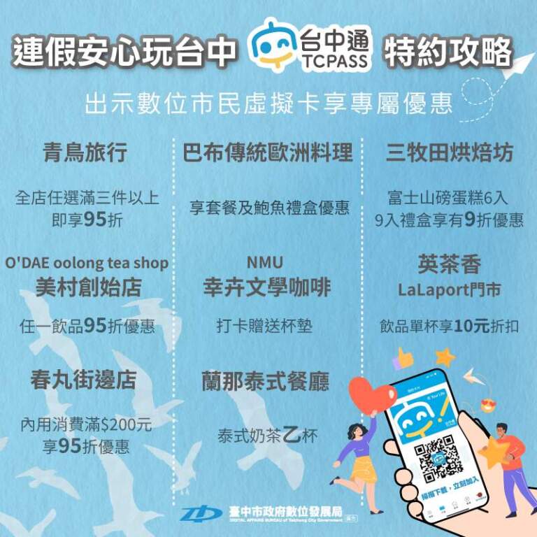 【互傳媒/記者 張學宜/台中 報導】228連假即將到來,同時中台灣燈會「幸福蜜馬 台中MOOMIN ON!」展期已進入倒數最後一週!台中市政府數位發展局邀請全國民眾把握假期,來場台中城市輕旅行。為了讓民眾玩得盡興又省錢,數位局推薦出遊前先下載《台中通 TCPASS》APP,憑數位市民虛擬卡即可在超過1600家特約店家享有專屬優惠,從人氣伴手禮到在地美食應有盡有,讓連假行程更加精彩豐富。