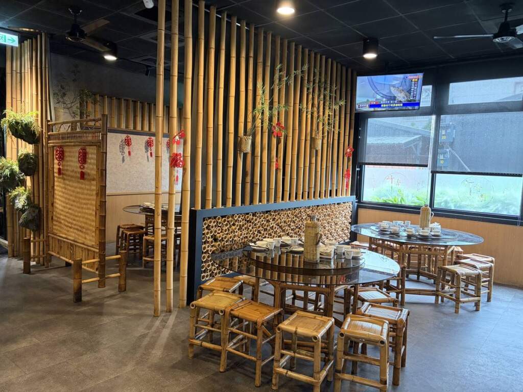 竹香園嘉義店空間設計大量運用天然竹材元素,搭配竹子水墨畫妝點牆面,整體氛圍通透而富禪意。以竹為屋、以火為魂、以雞為藝,讓顧客在山林意象環繞中用餐,彷彿遠離塵囂,展開一場視覺與味覺兼具的療癒旅程。