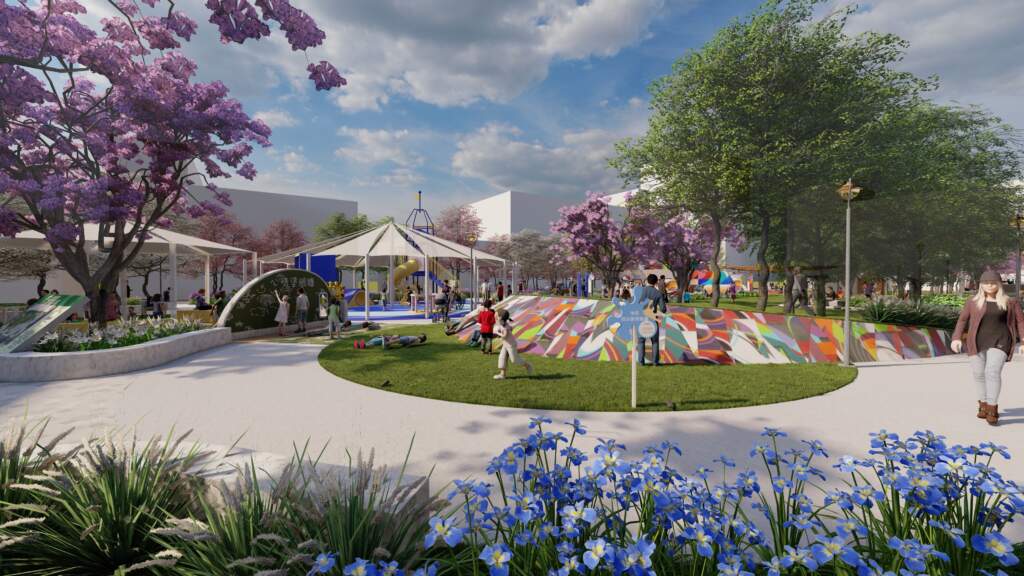 陳大田指出,公園面積為3,384平方公尺,整體設計以「街區再生、活力藝術」為核心理念,在保留歷史紋理基礎上導入當代表現語彙。公園內設置溜滑梯、遊戲沙坑及「市場家家酒」主題設施,讓孩童在遊戲中延續市場生活意象;體健區則配置銀髮友善運動器材,完善鄰里健康空間;另設塗鴉主題牆作為視覺焦點,提供創作與交流場域,拉近藝術與市民距離。