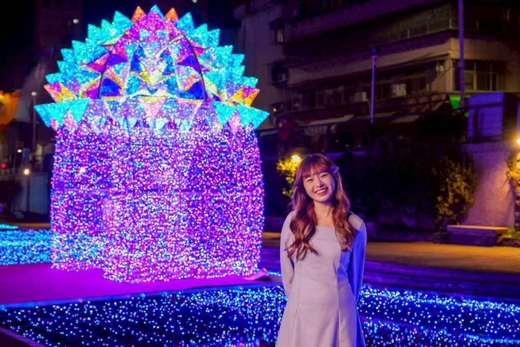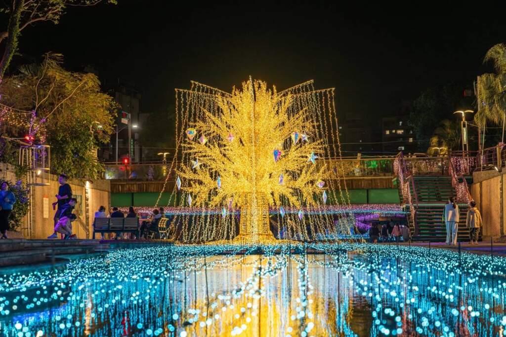 ▲7米高星耀之樹閃耀新莊夜空。水利局長宋德仁表示,光雕展結合多元光影與浪漫燈飾設計,營造一條屬於中港大排的夢幻星河,讓民眾在流動星光中漫步河廊,感受城市夜景之美。全場共規劃四個主題區域,分別為「光之啟程」、「星願冰原」、「夢行星河道」與「星語花境」,以璀燦繽紛燈飾結合光雕投影,沿著蜿蜒河廊展開,並串聯自信橋、幸福橋、昌盛橋、昌隆橋等陸橋,形塑連續而豐富的星河廊道,喚起民眾的美好記憶。
