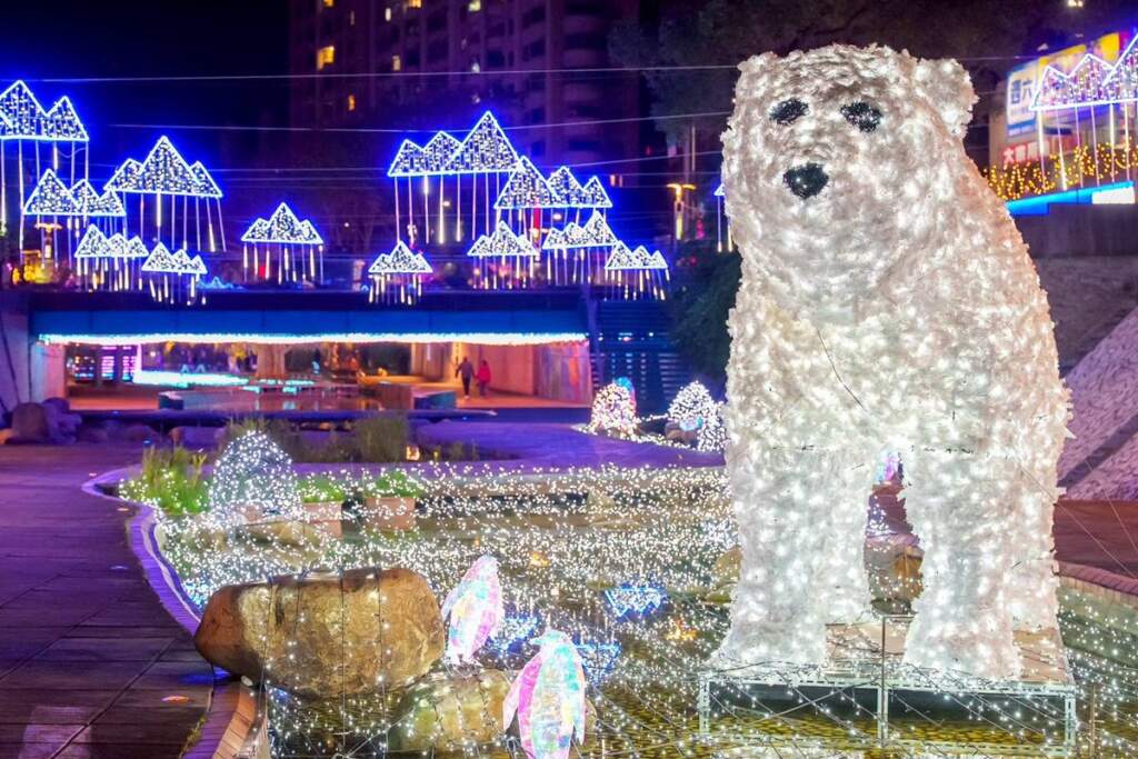 ▲由星光與月色編織而成的星月之門,展開一段通往星光國度的奇幻旅程。宋德仁補充,今年最吸睛的亮點是位於自信橋下的「星耀之樹」燈光裝置,7米高的立體發光樹裝飾中港河廊,彷彿被帶入一場由光芒與星河編織的浪漫夢境。現場還有3米高雪白北極熊現身,搭配可愛俏皮的企鵝群,營造極地奇幻氛圍;橋下及樓梯扶手欄杆還布置璀璨浪漫燈飾,超過三百萬盞LED燈相互輝映,交織點亮整個中港河廊。