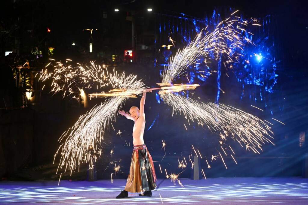 ▲開幕表演由「即將成真火舞團」獻上限定作品《馬祥厚運 火耀新北》,表演者「以烈火神劍為筆、中港水域為紙」,具象化地為市民「轉動厚運」。開幕表演由「即將成真火舞團」獻上限定作品《馬祥厚運 火耀新北》,表演者「以烈火神劍為筆、中港水域為紙」,具象化地為市民「轉動厚運」,並由曾登上英國大型選秀舞臺的團員楊立微帶來精湛足技與獨創火桌秀。火舞團令人驚豔的演出也讓侯友宜大讚精彩,期待團員未來持續以精湛的技藝揚名國際。