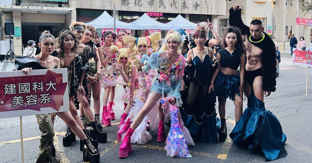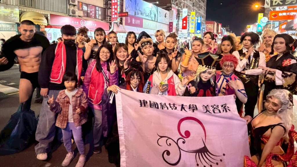 ▲彰化市公所今晚舉辦「踩街國際嘉年華」,建國科技大學美容系師生也加入踩街行列,在教務長蕭蓉禎的支持下,由鄭寶琪帶領學生團隊,以精心打造的整體造型走上街頭展演,成為活動中的一大亮點。(圖/建國科大提供)教務長蕭蓉禎表示,學校讓學生將專業學習走出教室,透過城市參與,累積足夠展演經驗,同時讓社會大眾看見建國美容系的多元發展。沿途民眾夾道熱情歡呼,搶著拍照,擠得水洩不通,甚至後面的隊伍都受到影響。