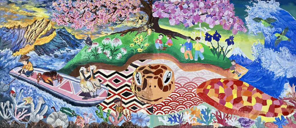 此次跨國藝術合作以海龜為壁畫中心意象,象徵臺日攜手邁向永續未來。壁畫右側呈現日本景象,包括櫻花、富士山、鳶尾花、綠鴿以及浮世繪風格的海浪紋樣,畫面中描繪人們使用環保購物袋、撿拾垃圾、植樹與風力發電等行動,象徵人類以具體作為回應氣候變遷。左側則展現臺灣自然生態特色,以玉山為背景,搭配梅花、紫斑蝶、艷紅鹿子百合、黑面琵鷺與螢火蟲等代表性物種,並描繪珊瑚復育與海洋淨灘的畫面,呈現守護自然環境的努力與成果。