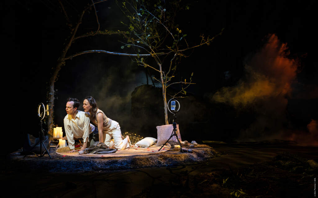 ▲2026 NTT Arts NOVA 比利時靜物劇團《這就是人「森」啊!》_諷刺地呈現人類如何將「四面牆內」的行為慣性帶入大自然,在世界末日的邊緣仍渴求虛擬世界的關注。©Alice Piemme
