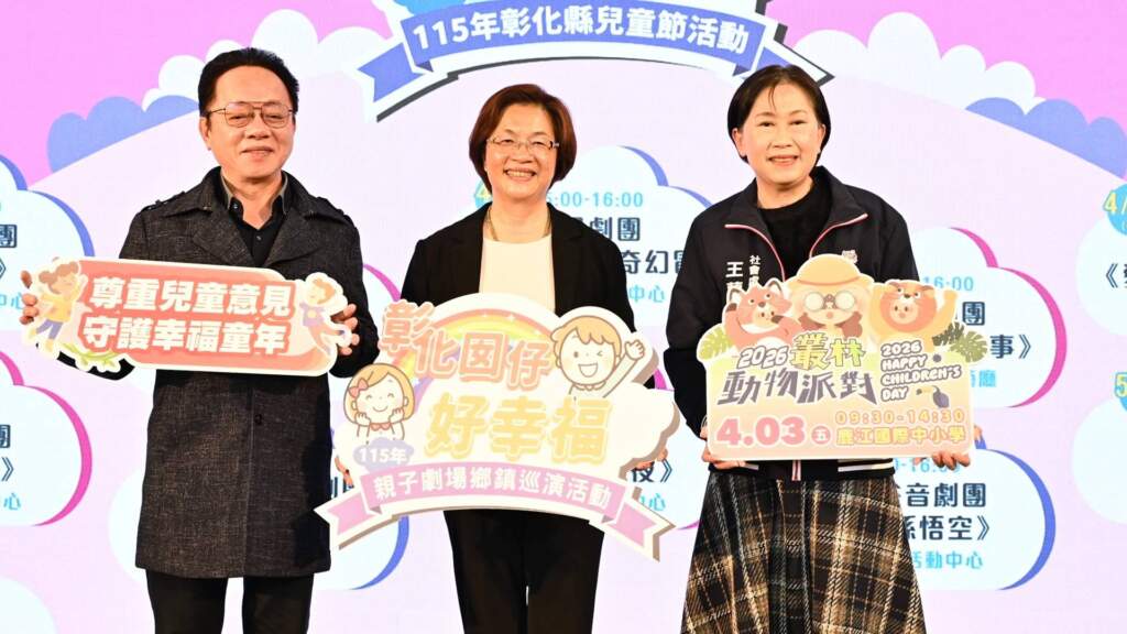 【互傳媒/記者 林明佑/彰化 報導】歡慶115年兒童節,彰化縣政府整合文化局、社會處及教育處資源,攜手辦理「彰化囡仔好幸福─115年兒童節慶祝活動」,今(12)日上午在縣府中庭舉行宣傳記者會。彰化縣長王惠美表示,兒童節即將到來,系列活動將從3月17日至5月23日輪番登場,包含模範兒童表揚、兒童節主題慶祝派對,以及10場親子劇場鄉鎮巡演,深入本縣8大生活圈,邀請親子共度歡樂時光,為童年留下幸福回憶!