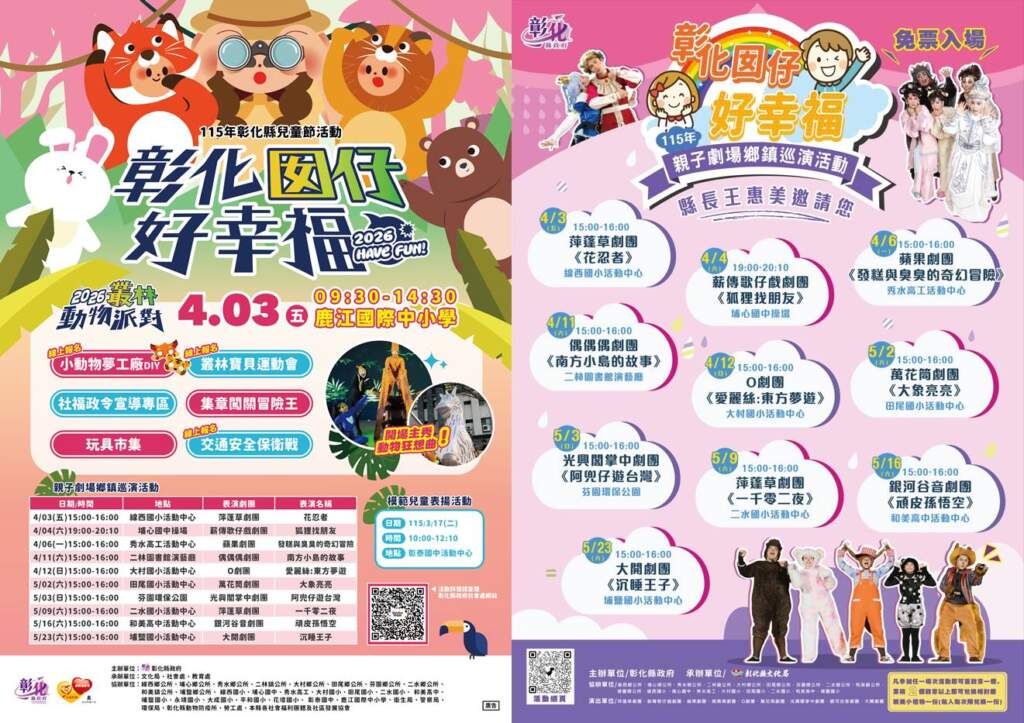 彰化縣文化局長張雀芬表示,4月3日至5月23日的週末假期將規劃10場次親子劇場巡演,安排9個國內優質劇團至本縣8大生活圈演出。邀請彰化縣傑出演藝團隊「萍蓬草劇團」於4月3日(五)下午3時在線西國小活動中心演出《花忍者》,以及5月9日(六)下午3時在二水國小活動中心演出《一千零二夜》;4月4日(六)晚上7時在埔心國中操場由2025年Taiwan Top演藝團隊「薪傳歌仔戲劇團」演出兒童歌仔戲《狐狸找朋友》。