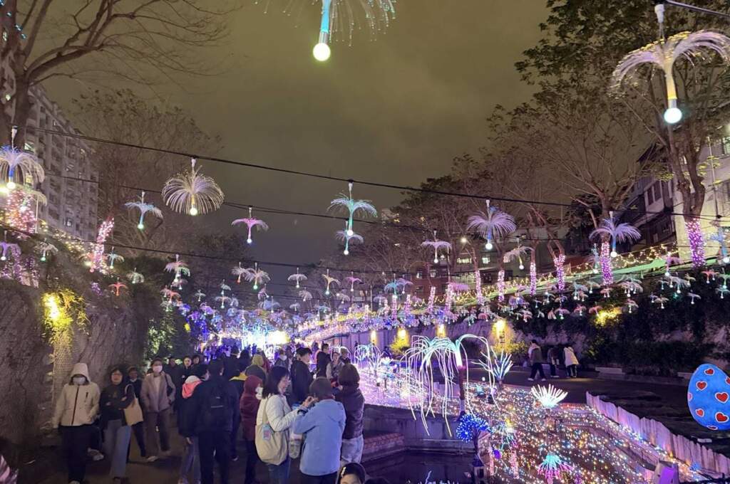▲中港大排光雕展一年比一年炫麗,遊客們沉浸在神秘夢幻的秘境裡。宋德仁說,此次光雕展規畫四大主題展區,最受矚目的必拍打卡亮點為自信橋下、高達7公尺的立體發光裝置「星耀之樹」,再搭配各式各樣夢幻華麗燈飾,綿延1公里的絕美光影河廊,有奇幻無比的星河幻境、由星光匯聚的星潮之海、浪漫繽紛的星月之門等等,還有可愛的動物北極熊出沒,每個展區都美如仙境,讓新莊變身成為一個夢幻般的燈光世界,浪漫氛圍滿溢。