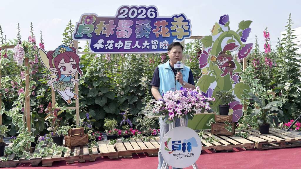 【互傳媒/記者 林明佑/彰化 報導】彰化縣員林市春季觀光亮點「2026員林蜀葵花季」將於3月28日繽紛登場,員林市公所今(19)日上午在南區公園旁蜀葵花田舉辦開幕宣傳記者會,特別邀請選秀節目《聲林之王》人氣歌手鄭可強(小烏龜)現場演唱,以溫暖歌聲揭開花季序幕,今年員林蜀葵花季以「花中巨人大冒險」為主題,結合花海景觀與互動遊戲,員林市代理市長賴致富邀請民眾走進繽紛花田,體驗春日浪漫。