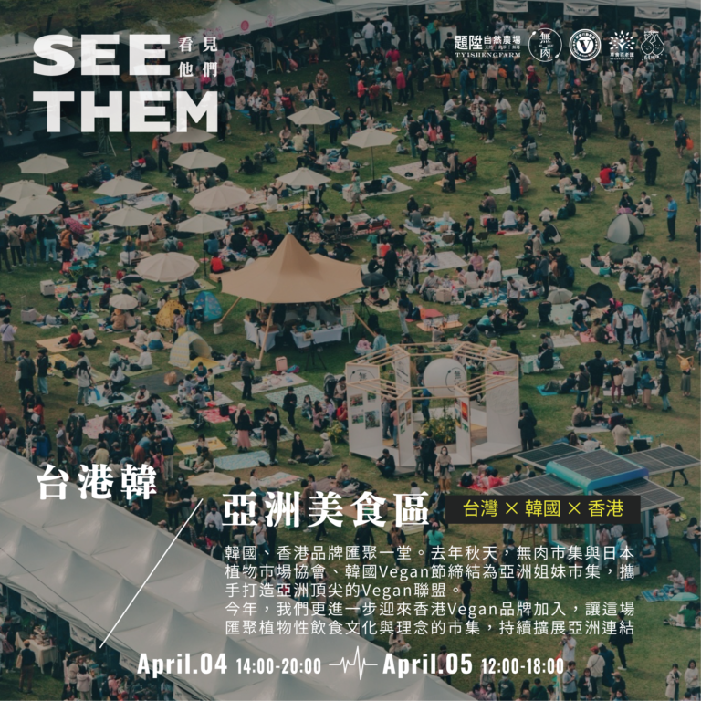 【互傳媒/記者 蕭任峰/台中 報導】由題陞自然農場與純植行動聯盟主辦的 Vegan Asia 無肉市集,將於 2026 年 4 月 4 日至 4 月 5 日於台北表演藝術中心舉辦年度主題策展《看見他們 See Them》。本次活動結合「六感沉浸式策展」、「跨界音樂展演」與「亞洲百大 Vegan 跨國市集」,以打破人類本位視角為核心,透過藝術與生活提案,引領大眾重新思考人類、動物、土地與未來之間的共生關係。