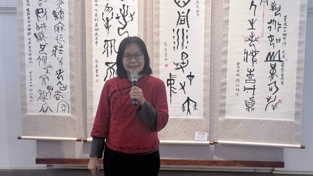 ▲彰化縣甲骨文學會總幹事楊英鳳表示,學會歷經二十餘載的穩健成長,歸功於歷任會長的卓越領導。(圖/記者林明佑攝)彰化市公所期盼透過本次聯展,讓民眾近距離欣賞中華書法與水墨藝術之美,進一步認識彰化深厚的人文底蘊與文化資產價值,共同感受甲骨文字藝術跨越時空的魅力,誠擎邀請各界把握展出期間,於4月12 日前(每日9時至17時,週一休館)前往彰化藝術館免費參觀。