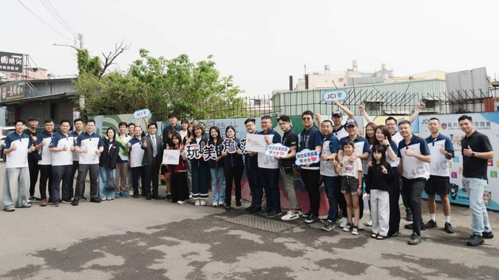 ▲龍津高中美術班創作的彩繪牆,是2026年龍井青商「玩美角落5.0計畫」中的一部分。(圖/龍津高中提供)適逢週末假日,龍井青商會特別舉辦「社區藝術亮點」揭幕活動,由會長紀昱全主持,並邀請市議員吳瓊華、林昊佑、龍井區長何宜真及龍井區體育會理事長紀榮利等人到場祝賀。龍津高中則由校長彭佳偉率領美術教師王家佑與陳暄蓉、王浿庭、徐湘慈、陳妍妮等學生共同出席,見證成果發表。