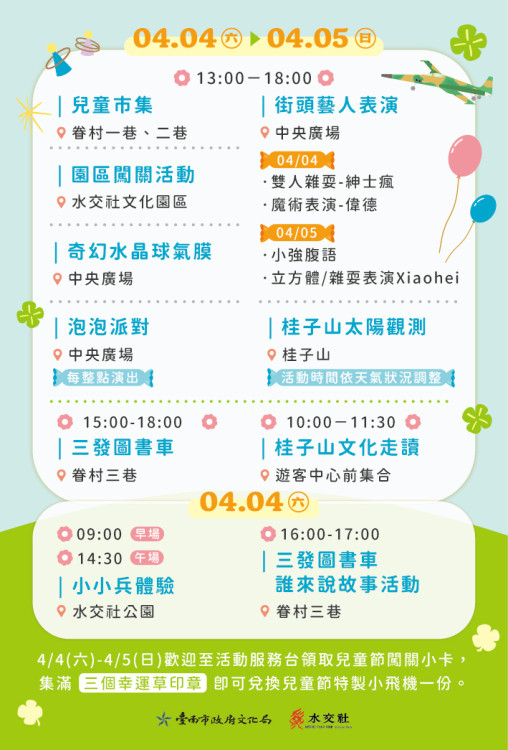 兒童節期間有兩天趣味闖關,將眷村童趣與水交社空軍元素結合,如「一 "童" 套套圈」等關卡,完成三道關卡集滿幸運草印章可兌換特製小飛機,以園區 F-86 軍刀機為模型,樣式可愛。現場大型充氣奇幻水晶球是打卡亮點。