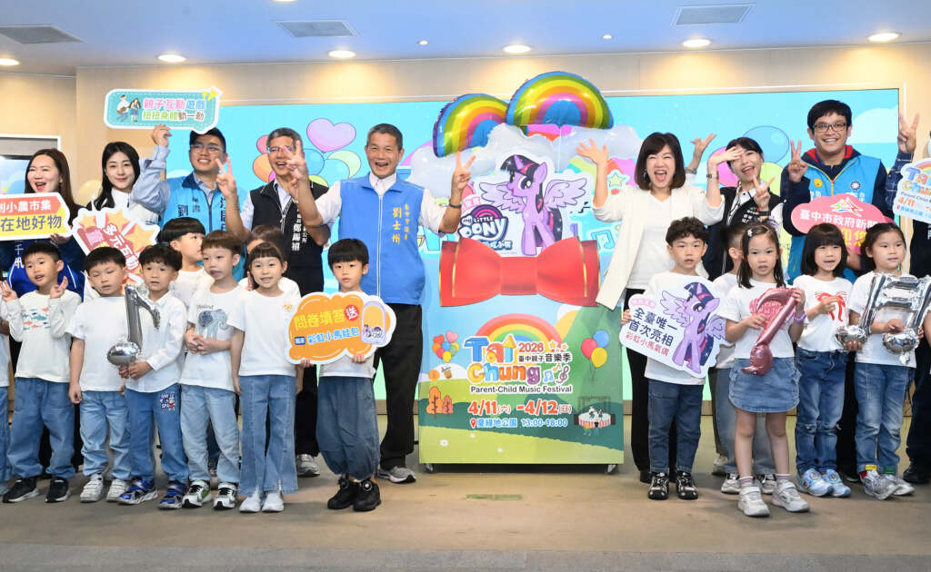 【互傳媒/記者 張玉泰/台中 報導】台中市政府新聞局今(1)日舉行記者會,宣布「2026台中親子音樂季」活動開跑。新聞局長欒治誼表示,4月是充滿溫馨與歡樂的月份,適逢兒童節,市府每年都全力以赴舉辦親子音樂季,在市長盧秀燕的鼓勵與支持下,今年活動規模再升級,首度攜手全球知名IP「彩虹小馬」,於4月11日至12日在夏綠地公園打造全台首座5公尺高大型氣偶拍照區,邀請親子合影留念,還有獨家限量小禮可以帶回家。今日記者會邀請YOYO家族南瓜哥哥、天竺鼠姐姐與幼彩幼兒園小朋友熱情開場,帶來活力舞蹈揭開序幕,「彩虹小馬」人氣角色「紫悅」驚喜現身並一起完成啟動儀式,現場氣氛熱絡。