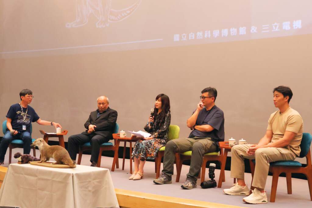 ▲左起科博館生物學組主任鄭明倫、科博館館長黃文山,戰地阿特首映會現場邀請導演白心儀與攝影師潘郁文、卓經國進行映後座談,分享紀錄片拍攝的起心動念及心路歷程。圖片提供/國立自然科學博物館歐亞水獺主要棲息於湖泊、池塘與河流等淡水環境,然而隨著棲地破壞與環境污染,族群已在臺灣本島消失蹤跡,目前全臺數量不到200隻。昔日砲火連天的戰地金門,則因人為干擾較少,意外成為牠們在臺灣最後的重要棲地。《戰地阿特》即以金門水獺為主角,以影像呈現戰地地景轉變為生態棲地的特殊樣貌,以及人與野生動物之間細膩的共存關係。