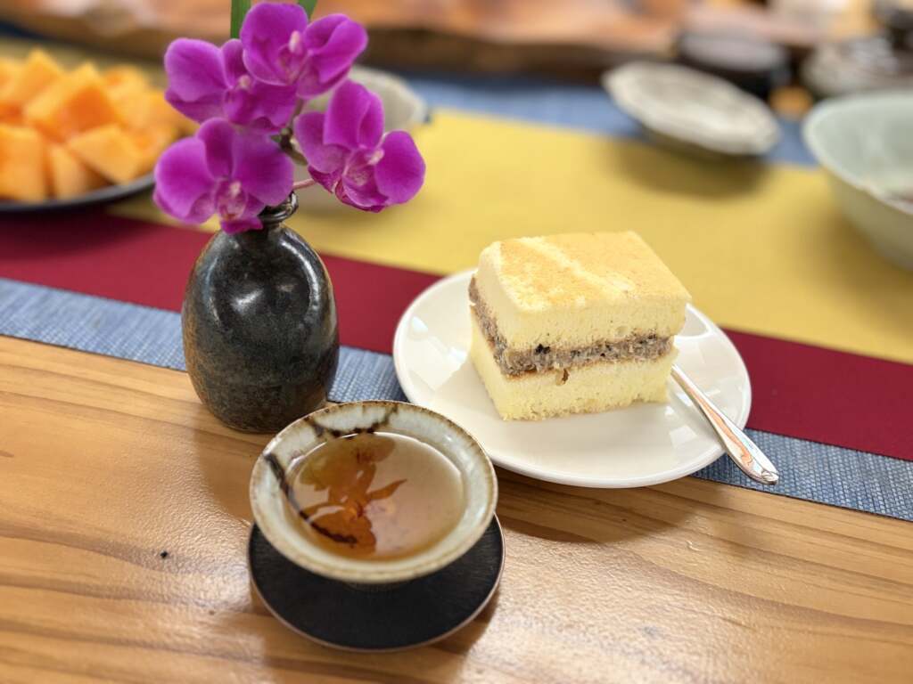 ▲甜點部分則由「鹿谷九份」女主人手工製作,包含竹筍鹹蛋糕、伯爵紅茶蛋糕與巴斯克乳酪蛋糕,為品茗時光增添豐富層次。(圖/記者蘇彩娥攝)空間內部更充滿藝術氛圍,陳列有書法家 莊一琳 的墨寶、藝術家 葉旻碧 的水彩作品,以及男主人親手創作的金工與攝影作品,讓整體空間層次更加豐富。旅人置身其中,品茗之餘也能細細品味藝術與生活交織的美好。