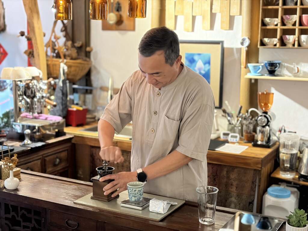 ▲「鹿谷九份」以茶與咖啡結合為特色,推出多款創新飲品。(圖/記者蘇彩娥攝)「鹿谷九份」由熱愛山林生活的曾裕仁夫妻親手打造,這棟約有六、七十年歷史的老屋,原為一間老舊麵店,歷經兩至三年過戶與整修過程,終於蛻變為如今兼具藝術氣息與人文溫度的茶空間。屋內保留約九成原始結構,包括木造樑柱、樓梯與老窗框,並融合現代設計元素,如自創木花窗結合玻璃鋁門,巧妙串聯室內外空間,使老宅在保有歷史紋理的同時,也展現全新視覺風貌。