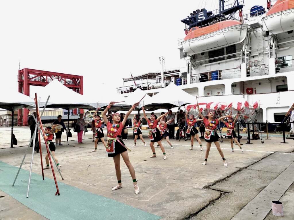 ▲原民風格舞蹈活力迎賓。觀旅局長陳美秀表示,島嶼天空郵輪船重4,200總噸,長度90.6公尺,船寬15.3公尺,今年首度造訪台中港,也是自疫情後首度靠泊台中港的郵輪,這次特別感謝台中港務分公司積極籌劃,由台中港引進國際遊客,台中市海線觀光在市府共同努力打造推廣下,有台中海洋館、三井Outlet、高美濕地、梧棲漁港、大甲老街等知名景點,皆是觀旅局於國內外旅展的宣傳重點,這次島嶼天空郵輪僅做短暫停泊,未來勢必能有更多機會與輪船公司及旅行社合作,迎接更多國際旅客透過郵輪靠港觀光。