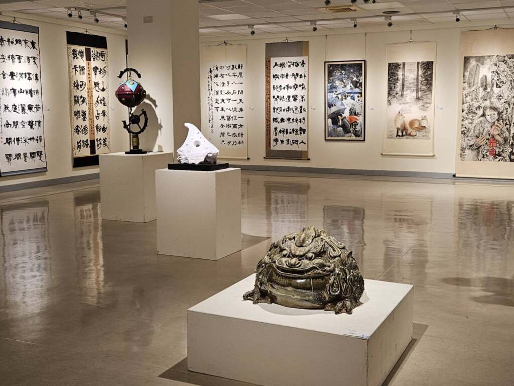此外,各類首獎作品亦各具特色、表現亮眼:膠彩部顏艷玲於《貓生拼圖》中,以流浪貓在未知環境中尋覓生存之地為主題,猶如在混亂中拼湊遺失的圖塊,透過層層烘染,生動描繪出貓咪多樣而靈動的姿態;油彩部林祐恩《潛夢》以穩重的超現實空間構圖,展現深層意境;書法部顏國順《吳德功詩梧棲歸帆》書體運用多元,風格豐富;攝影部林連瑜《靦腆-抽象隱喻之印象》藉由殘荷意象,傳達出中國水墨畫的詩意韻味;雕塑部范鴻川《平行時空》展現對空間層次的深刻想像;水彩部黃煜炘《平行時空》筆觸層次分明,善於掌握光線流動與明暗變化,營造出靜謐而真誠的祈福氛圍,皆為一時之選的精彩佳作。