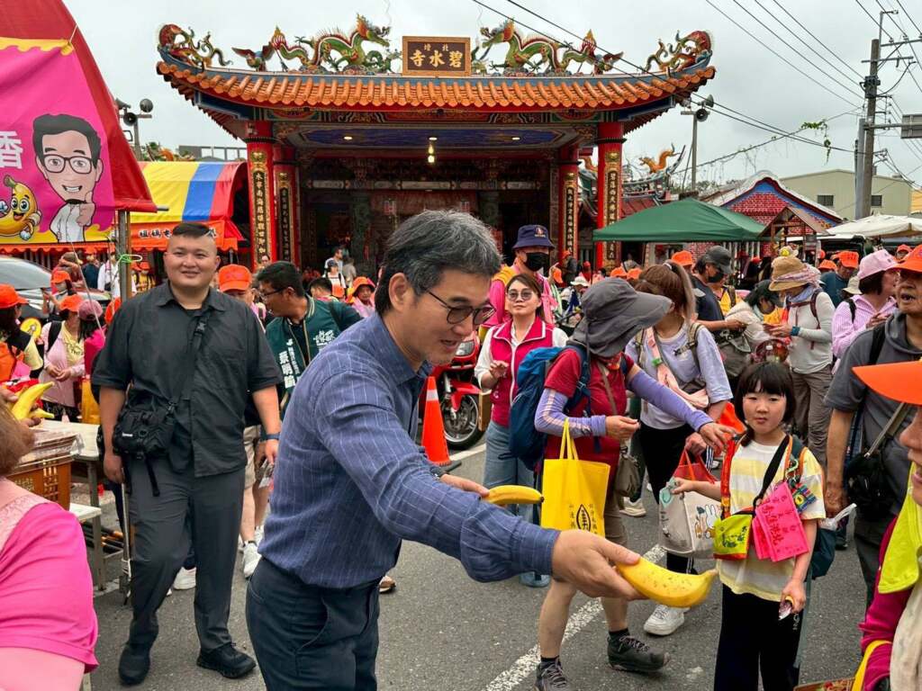 【互傳媒/記者 劉美君/雲林 報導】白沙屯媽祖徒步前往北港進香,是台灣年度最具影響力的宗教盛事。為了遠道而來的香燈腳們,民進黨秘書長徐國勇、立法委員劉建國,與雲林在地合作社及蕉農攜手,於北港進香路線設置熱血應援站。現場除了發放雲林在地優質香蕉補充體力,更特別發送「民主香燈腳」飄帶,邀請信眾一同感受媽祖慈悲,並祈求國泰民安。