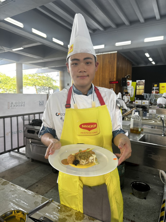 陳昱安奪下 1 銀 1 銅,開學前剛完成台北米其林一星餐廳實習,將所學多元香料運用與烹調技法融入賽事,用「台灣春捲皮」包裹圓鱈,製作耗時的「荷蘭醬」與「天鵝絨醬」,以多層次味覺和細膩質感征服評審。