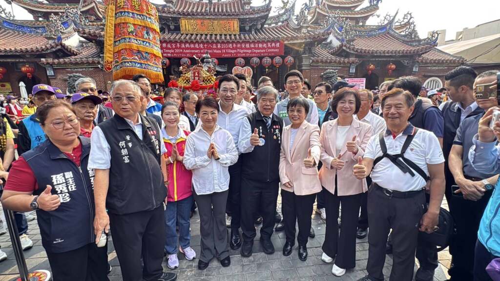 ▲旱溪媽祖遶境十八庄祈安植福活動合影。(圖/記者林明佑攝)今天起駕,上轎儀式,由臺中市長盧秀燕及樂成宮董事長何敏誠率領現場眾來賓行五獻禮祝禱,恭請媽祖移駕、上轎安座、點燃起馬砲及恭送起駕等重點儀式。遶境隊伍依序由頭燈、大旗、小宮燈、繡旗隊及三十六執事等陣頭展開,整齊列隊於廟埕兩側,女子神轎班踏著禮步向殿內眾神辭行,儀式井然有序。沿途信眾手持清香,虔誠恭送媽祖與喀哩新南宮媽祖出巡,氣氛莊重而感人。