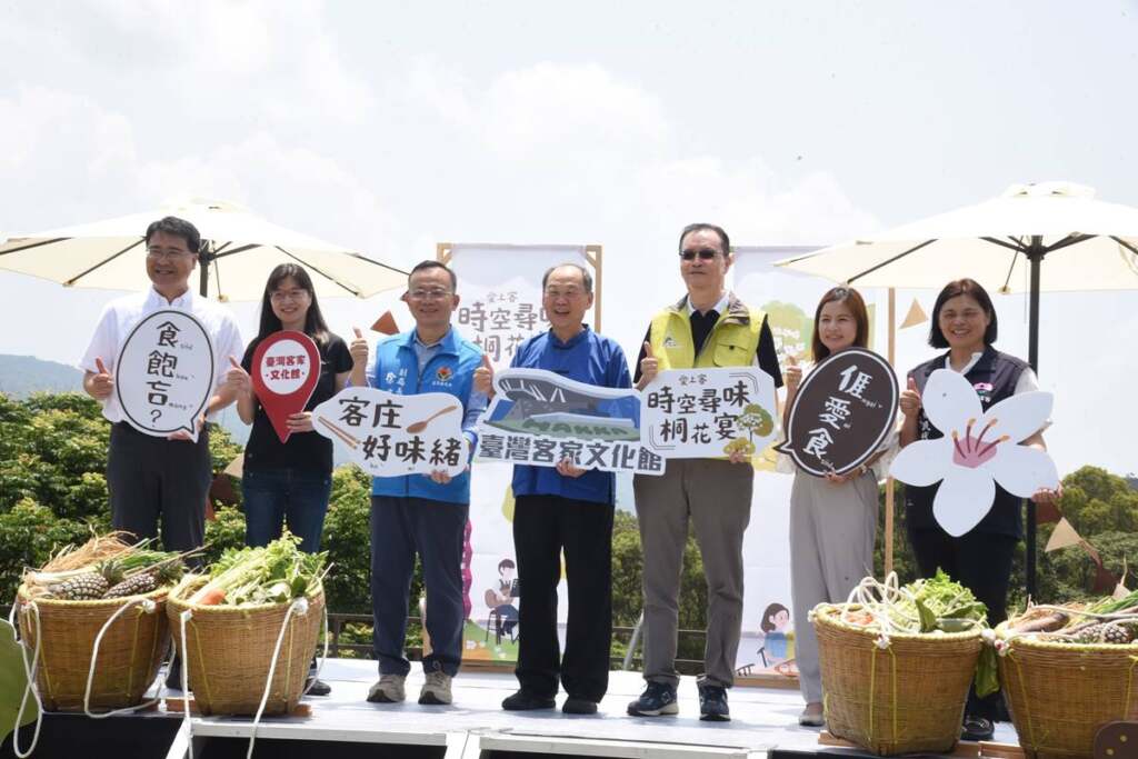 ▲客發中心主任謝勝信與文觀局副局長主持啟動儀式。客家文化發展中心指出,此次宴席規畫以1910至1950年代為時空背景,營造濃厚復古氛圍,並特別規劃「挑擔開席」儀式。由美籍歌手賈斯汀攜手苗栗在地大襟客文化藝術團成員,身著復古服飾,挑擔宴席所使用的在地食材入場,重現昔日客庄場景。民眾既可品嘗到道地客家料理,也能認識客庄所孕育的豐饒物產,傳達活動契合感恩山林、回饋自然的精神。
