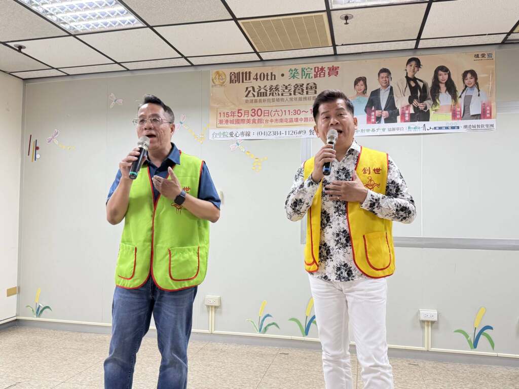 ▲創世台中院長與傅振輝獻唱成名曲「你是我的兄弟」。(圖/創世台中院提供)創世台中院院長陳韋龍表示,當初台中院是在全台愛心民眾及企業的捐助下才順利建成,為籌募嘉義新院建院經費,台中院將舉辦「創世40 築院踏實」公益音樂餐會,截至目前距離40餐桌尚有9成餐桌亟待認助。愛心餐桌每桌15,000元可10人用餐、餐券每張1,600元,亦可二次公益轉捐弱勢家庭使用,一份愛心兩份關懷。除了美食佳餚外,現場還有藝人歌手曹雅雯、傅振輝、陳怡婷、吳美琳、林琇琪等人為愛獻唱。期盼企業、社團及社會大眾能踴躍認助餐桌/券,幫助嘉義新院順利建成。愛心專線(04)2384-1126#9餐會小組;劃撥帳號:2202-2328 戶名:創世基金會(備註”愛心餐會”)