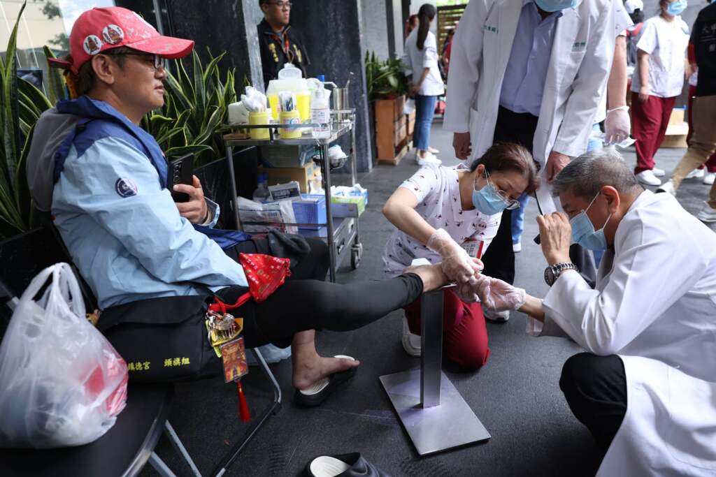 ▲醫師為香客處置傷口。(圖/記者林明佑翻攝)宏仁醫院總院長王斯弘提醒,雖然這幾天可能會下雨,不過天氣仍屬悶熱,信徒隨香步行,要特別預防熱中暑,尤其慢性病患者,要按時服用藥物,藥物也不要分別人吃,做好預防熱傷害,隨時補充水分,有任何狀況要及時就醫。