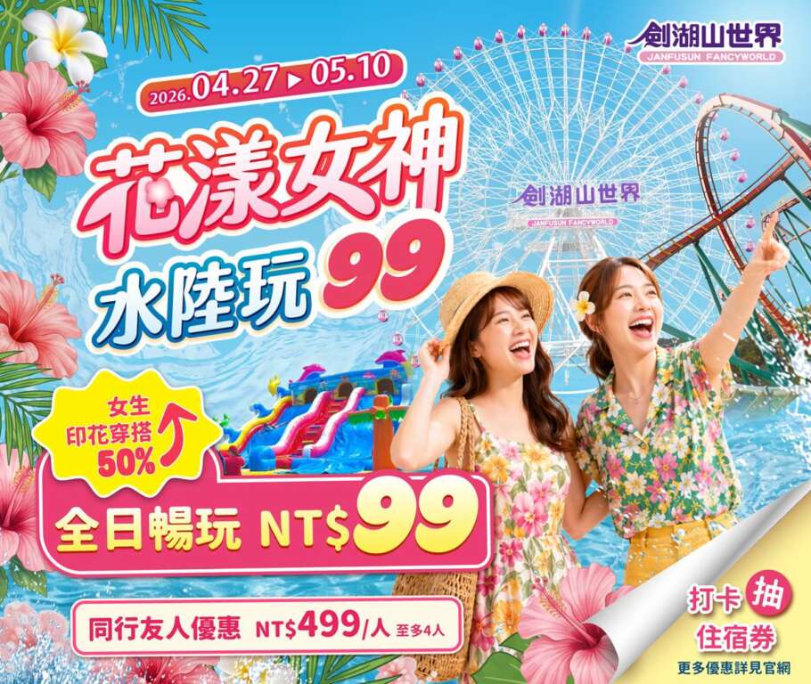 • 超殺優惠:只要穿上「花衣裳」(全身50%以上面積具滿版連續印花),本人門票全日暢玩僅需 99元!