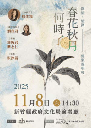 詹佳穎 近期演出 2025.12.06 (六) - 2025.12.06 (六) 臺中市中山堂 雷哈爾《風流寡婦》歌劇 新編演出 #台中愛樂 #歌劇 #The Merry Widow #陳殿冠 過往演出 2024.08.10 (六) - 2024.08.11 (日) 大稻埕戲苑 【歌仔戲】正明龍歌劇團《釵頭鳳之「拆」頭風雲?!》 #大稻埕戲苑 2024.11.23 (六) - 2024.11.23 (六) 臺中市中山堂 莫札特《費加洛婚禮》歌劇 新編演出 #台中愛樂 #歌劇 #Le nozze di Figaro #陳殿冠 2025.09.28 (日) - 2025.09.28 (日) 臺灣戲曲中心 《低・俗・畫本》烏犬劇場|2025戲曲夢工場 #戲曲中心 #戲曲夢工場 2025.07.04 (五) - 2025.07.06 (日) 臺灣戲曲中心 2025傳藝金曲劇展:毛斷計畫《文武天香》 #2025傳藝金曲劇展 #蔡逸璇 #古翊汎 #鄭紫雲 2025.09.21 (日) - 2025.09.21 (日) 臺中市港區藝術中心 新藝芳歌劇團《秋雪》 #詹佳穎 #曾佳卉 #吳妍菲 #吳可妮 2025.05.03 (六) - 2025.05.03 (六) 《樂來越愛媽》母親節音樂會 #鄉音室內樂團 #國立雲林科技大學雲泰表演廳 #國立雲林科技大學yuntech #財團法人豐泰文教基金會 2025.10.12 (日) - 2025.10.12 (日) 高雄傳藝園區台灣歌仔戲中心(建置中) 2025傳藝戲曲藝術季《文武天香》 #2025傳藝金曲劇展 #蔡逸璇 #古翊汎 #鄭紫雲 2024.05.18 (六) 《印象.映像》音樂會 #鄉音室內樂團 #國立雲林科技大學雲泰表演廳 #國立雲林科技大學yuntech 2025.08.29 (五) - 2025.08.31 (日) 臺北市藝文推廣處 2025 歌仔戲旗鑑展演《愛。相隨?》 #歌仔戲旗艦展演 #連台本戲 #天王天后跨團強強聯手 #廖瓊枝歌仔戲 2025.10.19 (日) - 2025.10.19 (日) 北港文化中心 2025「豐愛雲林 鄉音傳情- 音樂萬花筒」音樂會 #鄉音室內樂團 #詹佳穎 張淳菡 #Feng-Hsu Lee 黃俊達 林金陽 #馬惠明 兩兩探戈Tango.two 2024.03.31 (日) 臺北市中山堂 【傳藝舞繽紛】歌仔戲《王禪鬼點子》 #臺北市立國樂團 #正明龍歌劇團 2024.10.26 (六) - 2024.10.27 (日) 北港文化中心 2024「豐愛雲林 鄉音傳情- 音樂風情畫」音樂會 #鄉音室內樂團 #詹佳穎 #張淳菡 #Feng-Hsu Lee 劇照 多媒體影音 我們覺得或許你也會喜歡 曾博恩 藝術CV 比利時偷窺者舞團 清華木笛樂團 國立南科國際實驗高級中學附設國小部合唱團 影視聽中心人員 臺中市政府文化局(港區)