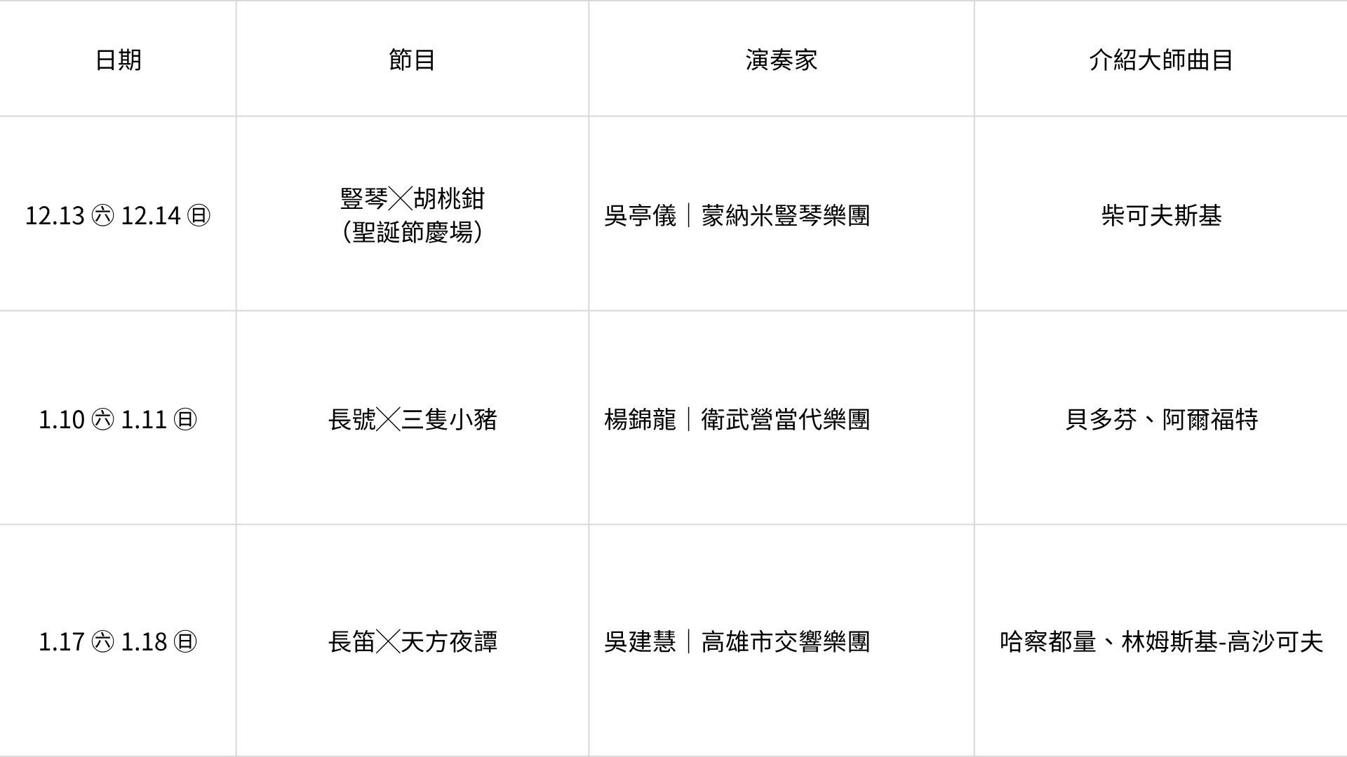 鄧棋薰 近期演出 2025.12.19 (五) - 2025.12.20 (六) 高雄市文化局-駁二藝術特區 笑點工作室《扯蛋的AI飯店》 #喜劇 #懸疑 #真實與虛假 #笑點工作室 2025.12.13 (六) - 2026.01.18 (日) 衛武營國家藝術文化中心 《小小音樂大師課》孩子們的冬季交響樂・高雄 #古典樂 #童話 #現場演奏 #幼兒 過往演出 2025.06.06 (五) - 2025.07.05 (六) 東興洋行 橄欖葉劇團×東興洋行《阿嬤,笑一個》回憶濕版 #橄欖葉劇團 #英華攝影藝術 #循霧啟室 #戲劇 2025.06.13 (五) - 2025.06.14 (六) 高雄市文化局-駁二藝術特區 2025 KSAF 春藝小劇場 両両製造聚團《小王子sió-ông-tsú》 #陳盈達 #小王子 #聖修伯里 #台語八音 2025.11.09 (日) - 2025.11.09 (日) 高雄市文化局-駁二藝術特區 2025正港雄有戲─橄欖葉劇團《紅眼睛》 #橄欖葉劇團 #紅眼睛 #戲劇 #表演藝術 2024.11.08 (五) - 2024.11.10 (日) 高雄市文化局-駁二藝術特區 2024正港雄有戲─橄欖葉劇團《四個都市叢林的求生者》 #橄欖葉劇團 #四個都市叢林的求生者 #高雄市政府文化局 #正港雄有戲 2024.09.13 (五) - 2024.09.28 (六) 新北市文化局-樹林藝文中心 原創泰雅音樂劇《織男・彼赫巫》 #傳源文化藝術團 #音樂劇 #原住民 #織男 劇照 多媒體影音 我們覺得或許你也會喜歡 左營國中 山嵐合唱團 萬花筒劇團 創劇團 美香歌仔戲班 中華民國一貫道慈善功德會