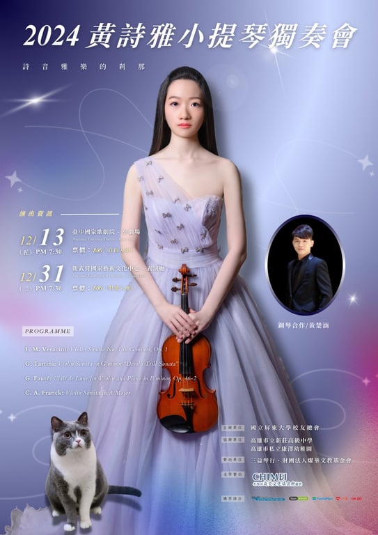 黃楚涵 過往演出 2023.12.16 (六) - 2023.12.16 (六) 六藝樂集 《飄泊人生-台灣歌謠故事音樂會》 #六藝樂集 #台灣歌謠故事 #經典老歌 #懷舊歌曲 2025.09.26 (五) - 2025.09.26 (五) 2025李宗霖長笛獨奏會《旅程》 #長笛獨奏會 #李宗霖 #黃楚涵 #音樂會 2024.08.07 (三) 衛武營國家藝術文化中心 道格拉斯的木管畫卷 #木管 #長笛 #雙簧管 #低音管 2025.03.16 (日) - 2025.03.16 (日) 衛武營國家藝術文化中心 堅持夢想-現代雙簧管音樂詩篇 #雙簧管獨奏會 #洪小琴 #黃楚涵 #林采誼 2025.11.18 (二) - 2025.11.18 (二) 國立臺灣大學藝文中心 半世紀的風華—向臺灣作曲大師致敬 (⾧笛篇) #長笛Flute #臺灣作曲家 #當代音樂 2024.12.20 (五) 國家兩廳院 周郁芝小提琴獨奏會 #小提琴家周郁芝 #德佛札克(A.Dvorak #1841-1904) #蘇克(J.Suk #1874-1935) #黃楚涵/鋼琴 2024.10.12 (六) 高雄市文化局-高雄市立文化中心 「美好時光」2024 黃楚涵鋼琴獨奏會 #鋼琴獨奏會 #黃楚涵 #音樂會 2025.07.08 (二) - 2025.07.20 (日) 高雄市文化局-高雄市立文化中心 協奏好好玩:VPA協奏⾳樂營發表會 #Veronica #維若妮卡 #吳悠 #周安瑞 2024.09.07 (六) 衛武營國家藝術文化中心 六藝樂集《少年仔來放送》台灣歌謠音樂會 #經典老歌 #台灣歌謠 #故事音樂會 #廣播實境秀 2025.09.20 (六) - 2025.09.20 (六) 高雄市文化局-高雄市音樂館 《仲間の音楽》單簧管室內音樂會 #單簧管 #低音單簧管 #法國號 #室內樂 2025.04.09 (三) - 2025.04.09 (三) 衛武營國家藝術文化中心 閃耀的回憶之旅 #山口雄理 #李英慈 #黃楚涵 #薩克斯風 2024.10.07 (一) 衛武營國家藝術文化中心 【極品.擊品】吳偉緯擊樂獨奏會 #吳偉緯 #擊樂 #首場擊樂獨奏會 我們覺得或許你也會喜歡 誠毅公司 李維造物 25時,Nightcord見。 國立臺灣戲曲學院-劇場藝術系 不貳偶劇 中山大學外文系