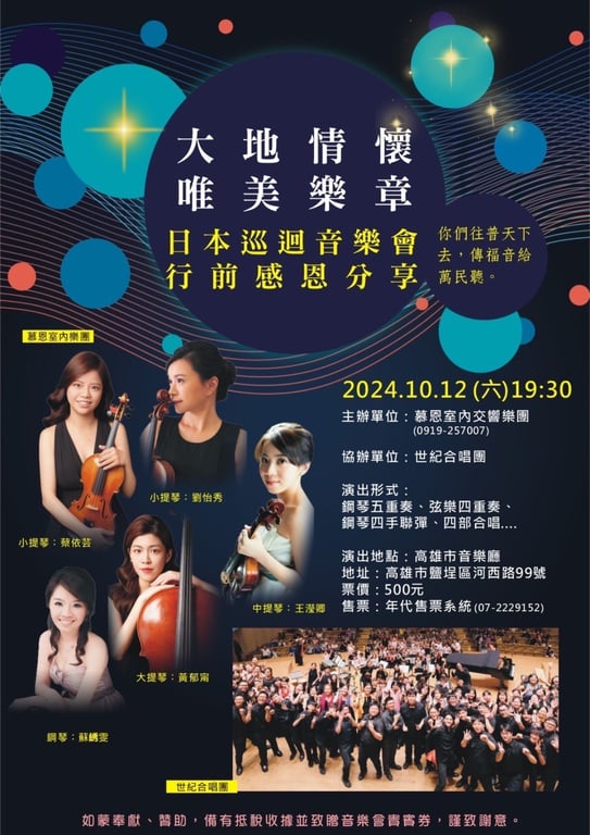 黃郁甯 近期演出 2025.12.06 (六) - 2025.12.06 (六) 國立成功大學 熱蘭遮失智症協會【走過---風花雪月】二十一周年慈善音樂會 #巴洛克獨奏家樂團 #請問芳名人聲樂團 #山嵐合唱團 過往演出 2024.12.13 (五) 高雄市文化局-高雄市音樂館 大提琴舞宴 #Hi Cello 大提琴X重奏團 #VC大提琴室內樂 #大提琴重奏 #舞曲 2025.09.27 (六) - 2025.09.27 (六) 臺中國家歌劇院 台中市交響樂團2025音樂之星音樂會—《神秘的名曲之旅》 #台中市交響樂團 #TCSO #張櫂玹 #音樂之星 2024.09.16 (一) 臺中國家歌劇院 法國爵士輕旅行—台中市交響樂團音樂之星系列音樂會 #台中市交響樂團 #張櫂玹 #爵士 #音樂之星 2024.10.12 (六) - 2024.10.12 (六) 高雄市文化局-高雄市音樂館 大地情懷・唯美樂章-日本巡演行前感恩音樂會 #音樂 #慕恩室內樂團 #世紀合唱團 我們覺得或許你也會喜歡 新竹縣田寮國小打擊樂團 巧連智 NIJISANJI 環心娛樂製作有限公司 A24 清翠交響管樂團
