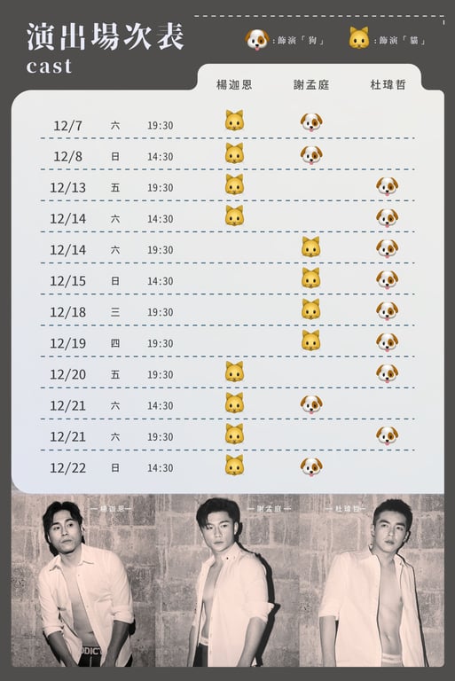 本劇主角貓和狗,將由新生代劇場偶像演員楊迦恩、謝孟庭和杜瑋哲輪流飾演,每場演出搭配不同攻受組合,敬請留意。