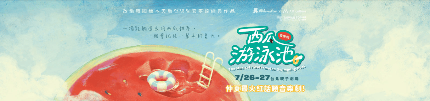 繼《Musical TARU! 恐龍復活了!》、《綠野仙蹤》全台掀起熱潮,家庭音樂劇領導品牌「安徒生和莫札特的創意」(AM創意)攜手韓國AMCulture,將韓國超人氣繪本改編為音樂劇——《西瓜游泳池》登場!