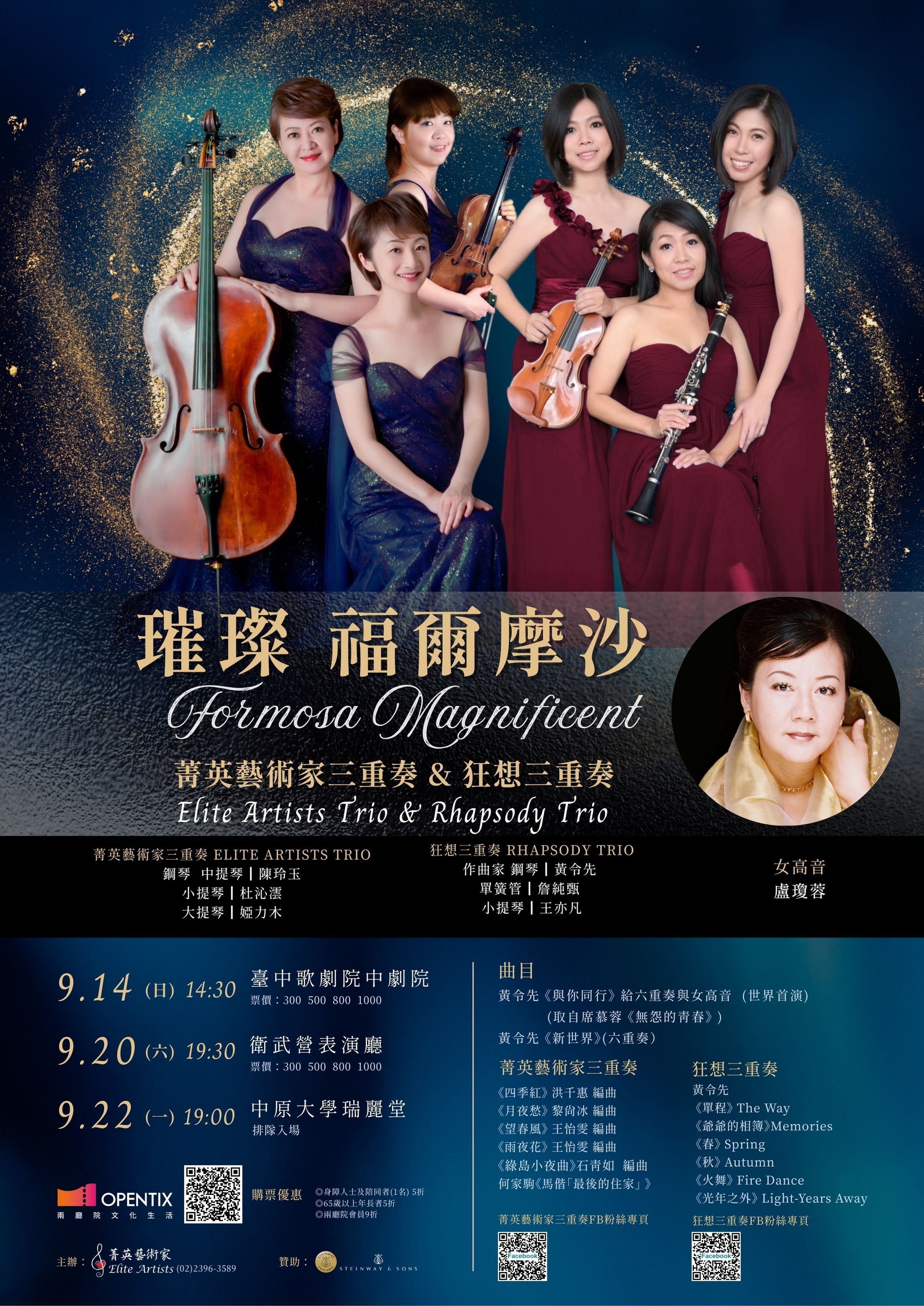 《璀璨 福爾摩沙》音樂會由菁英藝術家三重奏與狂想三重奏聯袂呈現,專注展演臺灣作曲家的傑出作品,呈現臺灣音樂豐富且多樣的文化內涵。音樂會將深入探索臺灣音樂的多元風貌,兩組三重奏團隊各自以獨特風格詮釋臺灣本土音樂,巧妙融合古典與現代元素。菁英藝術家三重奏專注於改編臺灣本土、客家及原住民的傳統音樂,通過創新手法賦予這些旋律全新的生命;狂想三重奏則以自由奔放的風格,融合古典與爵士,為臺灣作品注入現代活力,重新定義現代臺灣音樂的多樣性。菁英藝術家三重奏 (Elite Artists Trio) 由鋼琴家陳玲玉、小提琴家杜沁澐與大提琴家婭力木三位優秀音樂家組成,是臺灣唯一獲選為「史坦威藝術家室內樂團」(Steinway Artist Ensemble)的室內樂團。自成立以來,致力於推廣臺灣音樂文化,特別是將傳統臺灣民謠、客家與原住民音樂重新編曲,並通過國際巡演讓更多人了解臺灣多元文化。菁英藝術家三重奏定期委託臺灣年輕作曲家創作新作品,提升臺灣作曲家的國際能見度,並將這些作品推向全球觀眾。至今已發行七張《福爾摩沙》系列專輯,為臺灣古典室內樂發展立下新的里程碑。