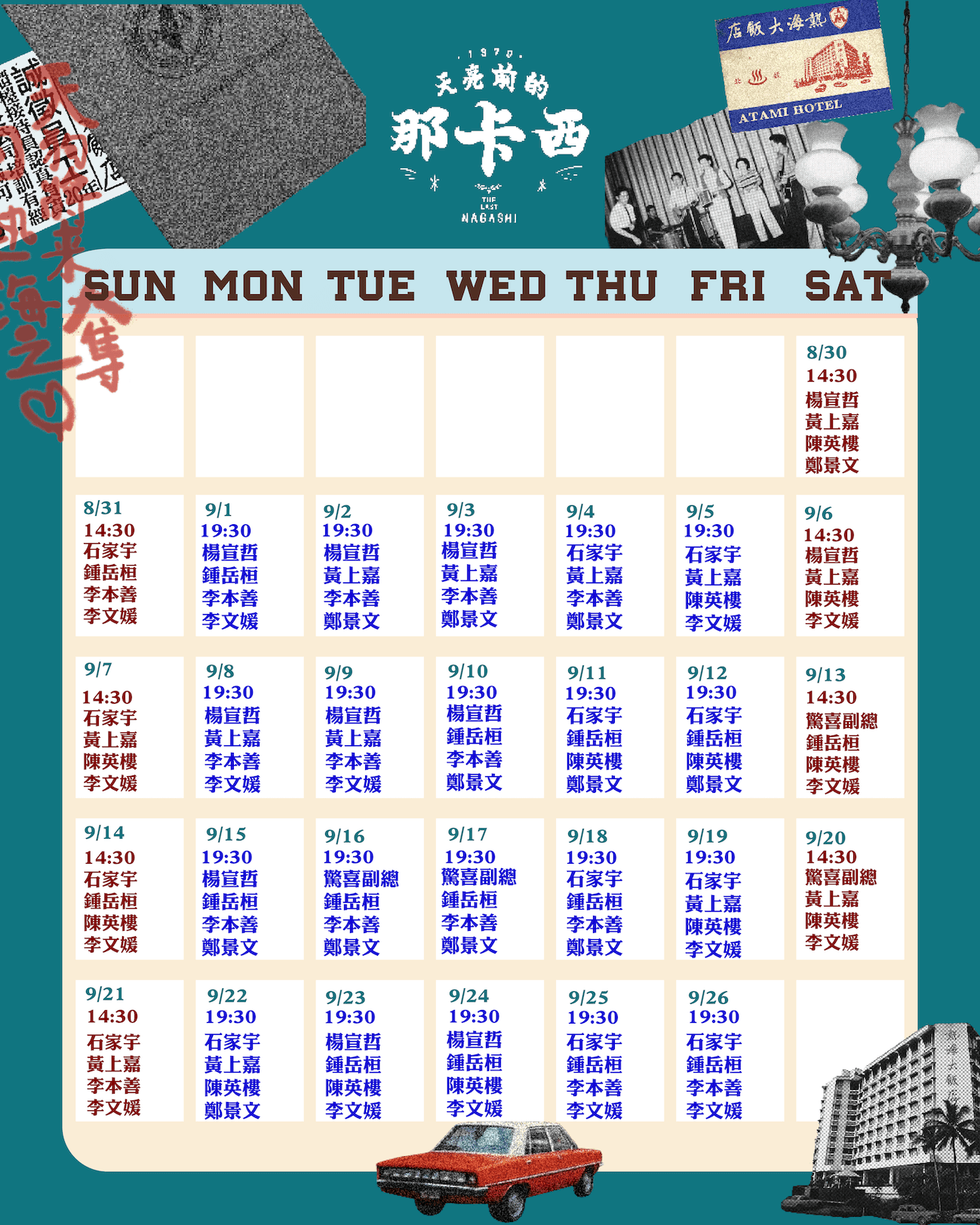 行政助理|李僑諦、侯思屹、吳雨靜演員|石家宇、李本善、李文媛、黃上嘉、陳英樓、楊宣哲、鄭景文、鍾岳桓(按姓氏筆畫排列)