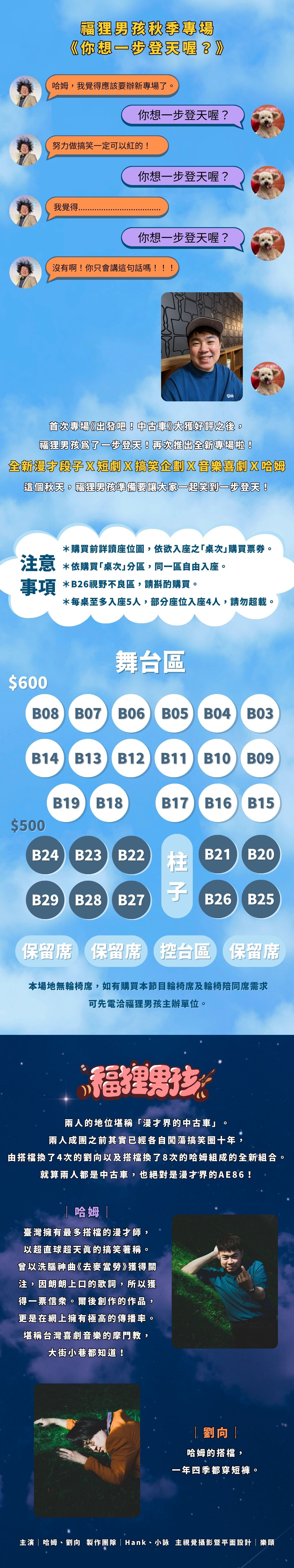 演出全長:約70分鐘,無中場休息,全場採分區自由入座,一人一票,憑票準時入場觀賞