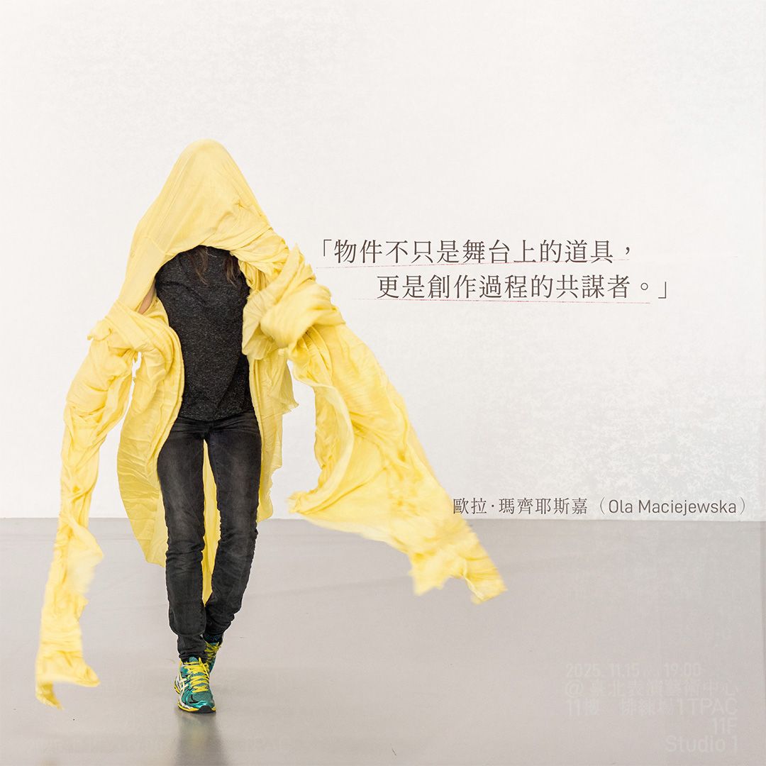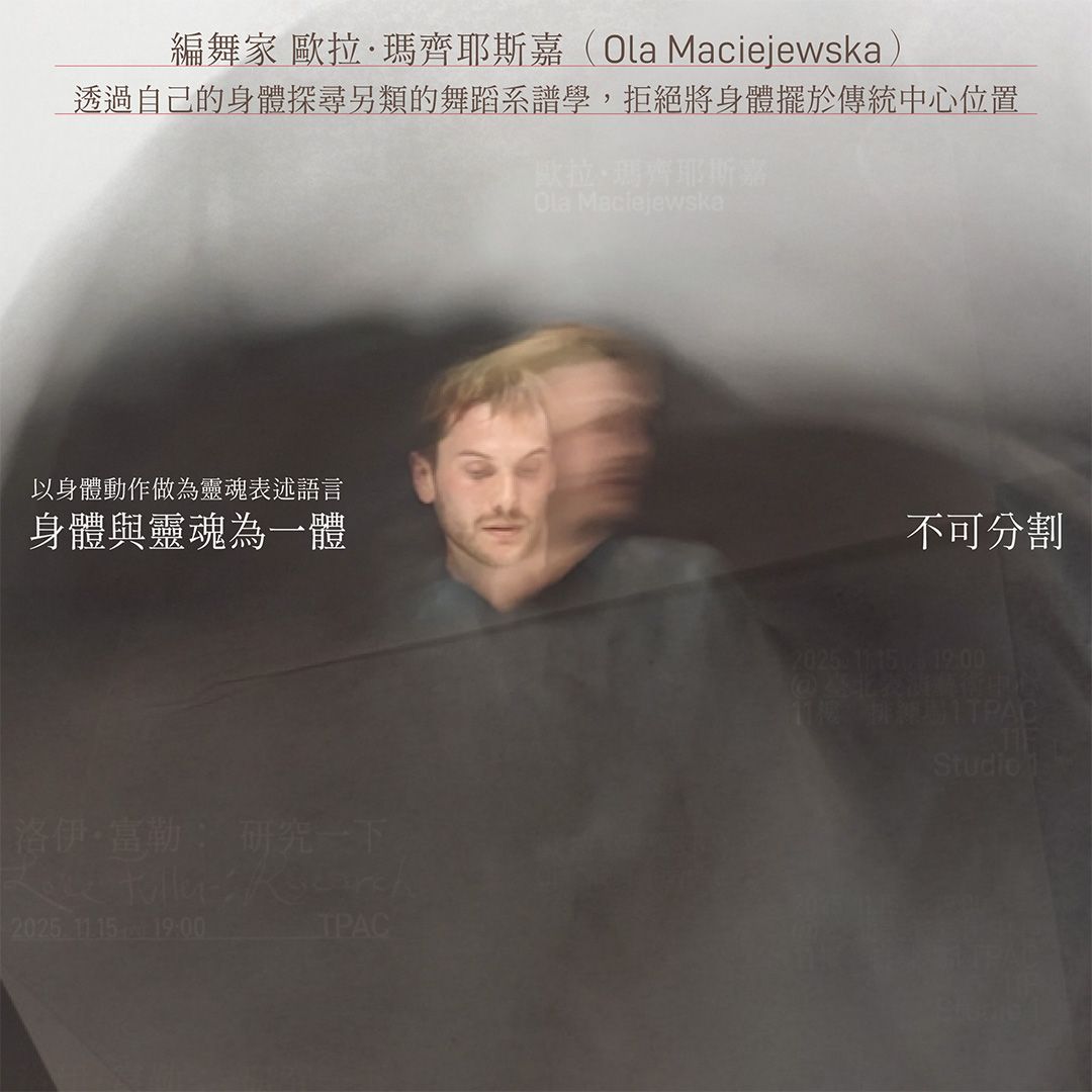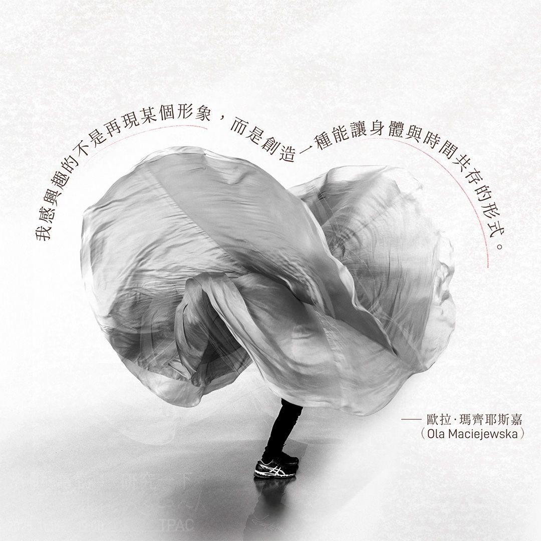 歐拉.瑪齊耶斯嘉擅於對舞蹈、雕塑與物件的跨領域的融合思考,她選擇從「技術的背後」出發,用自己的身體,去感受、去重新塑造那些被留下的材料——也就是光、布料與身體的關係。她從富勒的作品汲取靈感,拒絕將身體擺在傳統的中心位置,而是在探索表演媒材更平等的可能性。 正是這種兼具深度研究與創作實踐的背景,讓她成為當代我們重新解讀讀富勒的完美人選。她跳脫懷舊的再現、取消炫目的美學,轉而探問:當一段舞蹈成為神話,我們是否還能看到其中的身體勞動、物質抵抗以及形變的微妙?