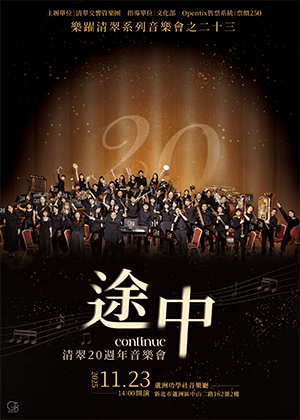 樂躍清翠音樂會已邁入第二十三場,恰逢清翠交響管樂團成立二十週年。今年以「途中」為主題,期盼帶領觀眾一同回顧清翠二十年來的點點滴滴,並在音樂的旅途中,繼續與我們同行。