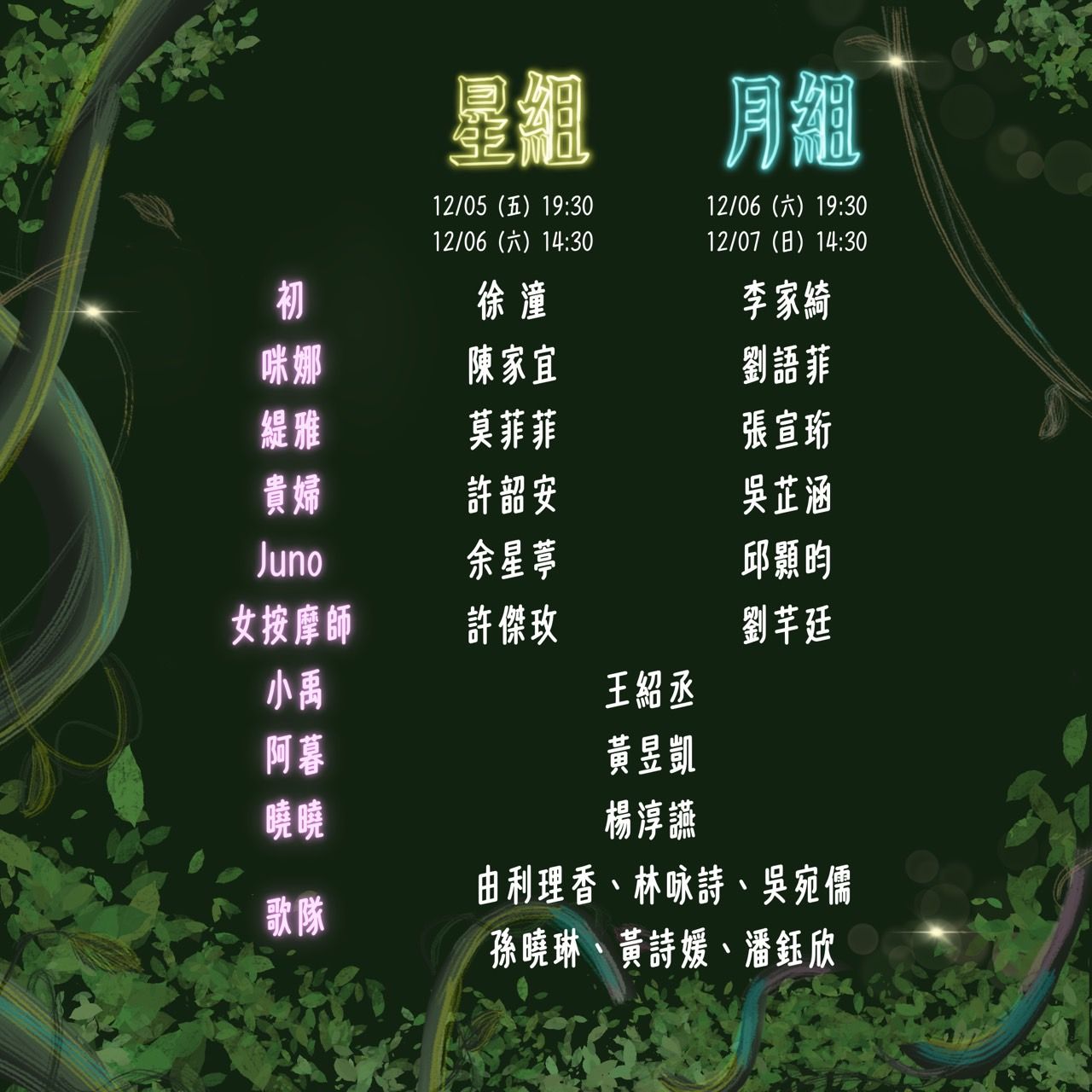 演 員|王紹丞、由利理香、余星葶、吳宛儒、吳芷涵、李家綺、林咏詩、邱顥昀、 孫曉琳、徐潼、張宣珩、莫菲菲、許傑玫、許韶安、陳家宜、黃昱凱、黃詩媛、 楊淳讌、劉芊廷、劉語菲、潘鈺欣