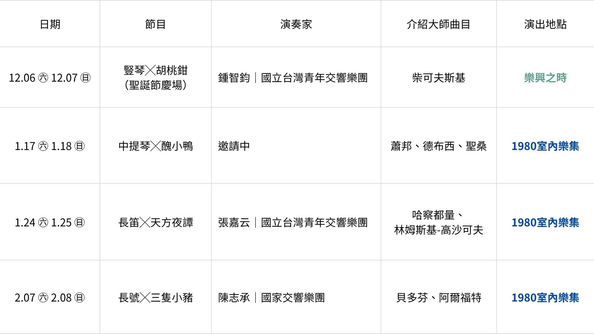 樂團國立台灣青年交響樂團、樂團賦格樂集、樂團國家交響樂團、演出者鍾智鈞、豎琴鍾智鈞、演出者沈書菡、鋼琴沈書菡、演出者張柏安、說書張柏安、演出者張嘉云、長笛張嘉云、演出者張立莆、說書張立莆、演出者陳志承、長號陳志承、演出者黃韻如、說書黃韻如
