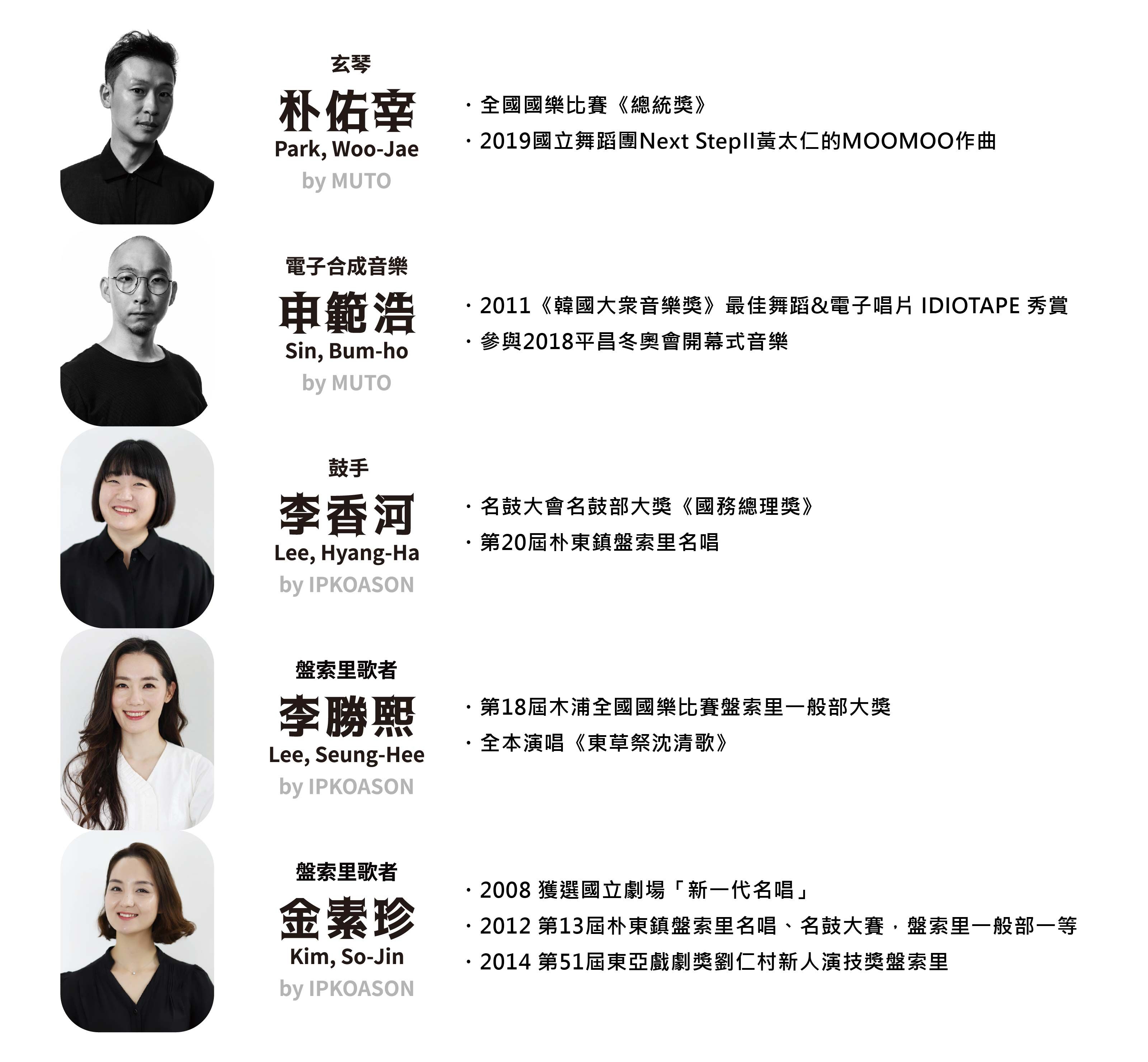 主辦單位國立亞洲文化殿堂、演出製作國立亞洲文化殿堂、演出製作MUTO、演出製作IPKOASON、主辦單位國立傳統藝術中心、演出巡迴國立亞洲文化殿堂財團、執行單位韻萊數位行銷有限公司、策畫朴序晛、演出者朴序晛、影像設計朴薰奎、演出者朴薰奎、製作人柳賢珍、演出者柳賢珍、燈光設計洪儹赫、演出者洪儹赫、燈光設計朴埈亨、演出者朴埈亨、數位製作金鍾勳、演出者金鍾勳、音響執行李知恩、演出者李知恩、音響金綵璘、演出者金綵璘、舞台執行金世訓、演出者金世訓