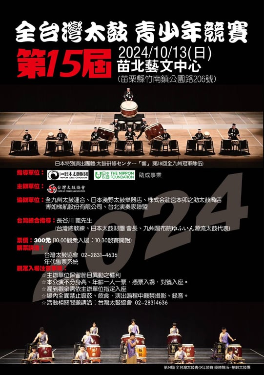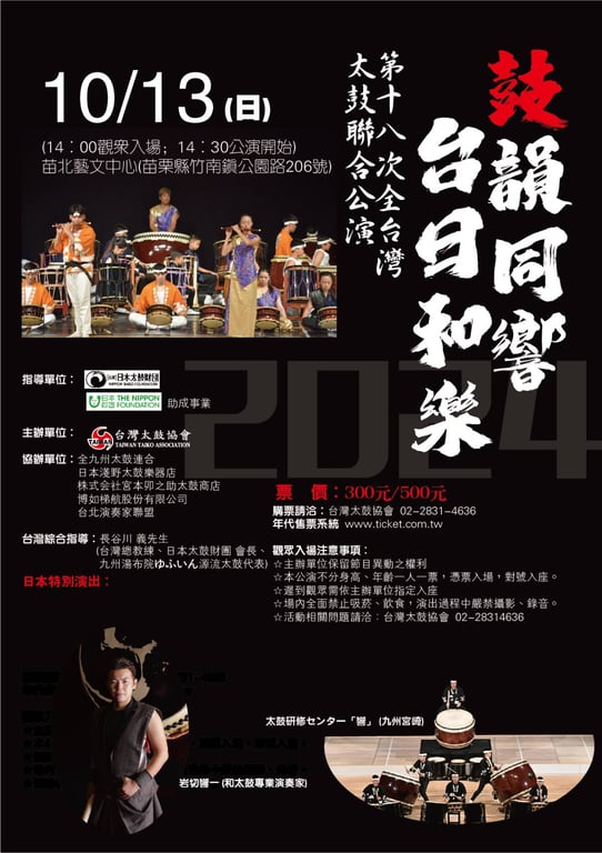 台灣太鼓協會 過往演出 2025.11.09 (日) - 2025.11.09 (日) 苗栗縣苗北藝文中心 『鴻福齊天‧祈鼓獻瑞』第十八次全台灣太鼓聯合公演 #太鼓 #音樂 #台灣 #日本 #演出 2024.10.13 (日) - 2024.10.13 (日) 苗栗縣苗北藝文中心 第15屆全台灣太鼓青少年競賽 #音樂 #太鼓 #競賽 #青少年 2025.05.25 (日) - 2025.05.25 (日) 國立陽明交通大學陽明校區 2025年度全台灣太鼓分組錦標賽 #音樂 #太鼓 #競賽 #文化 2025.11.09 (日) - 2025.11.09 (日) 苗栗縣苗北藝文中心 第16屆全台灣太鼓青少年競賽 #太鼓 #青少年 #競賽 #音樂 2024.10.13 (日) - 2024.10.13 (日) 苗栗縣苗北藝文中心 鼓韻同響.台日和樂 #音樂 #太鼓 #台日和樂 2025.02.14 (五) - 2025.02.14 (五) 福爾摩沙合唱藝術中心 鼓樂一致.台日共鳴 #中島美嘉 #鑽石舞台之夜 #巧虎 #翁倩玉 #林淑容 #2025國標舞亞巡賽 #2025國際沈文程日 我們覺得或許你也會喜歡 國藝會 視覺系樂團 聯合數位文創股份有限公司 囝仔人 阿美族馬蘭部落Pawtawan na kakita’an家族 啾啾藝術