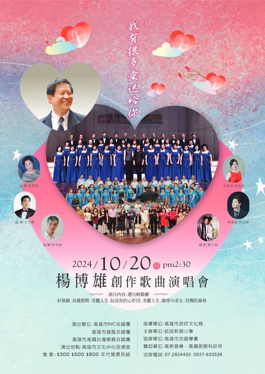 台灣美國鄉親合唱團 過往演出 2024.10.20 (日) - 2024.10.20 (日) 高雄市文化局-高雄市立文化中心 楊博雄創作歌曲演唱會 #音樂 #楊博雄 #合唱團 #演唱會 我們覺得或許你也會喜歡 稻草人現代舞蹈團 台北愛樂青年合唱團 約約伴單身交友俱樂部 Arod Quartet 幸福盈農銷(股)公司 何曉玫MeimageDance